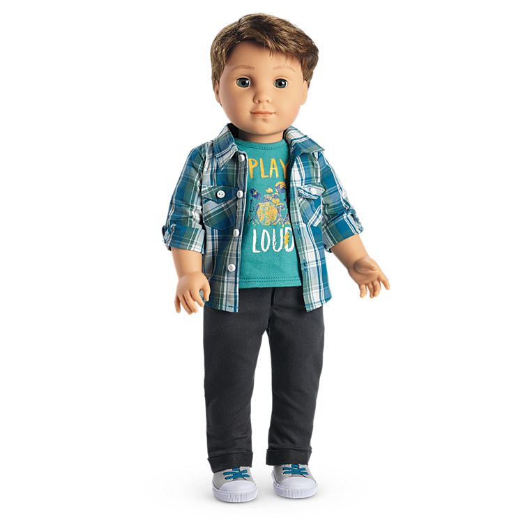Meet Logan, Tenney’s bandmate and drummer! The 18" Logan boy doll has gray eyes that open and close, and short brown hair. Logan’s unique hand positioning helps him hold instruments! He arrives in a plaid button-down shirt, a T-shirt, jeans, underwear, and shoes. Logan has been retired, and is no longer available for purchase at American Girl stores or online and is considered a collector's item.
